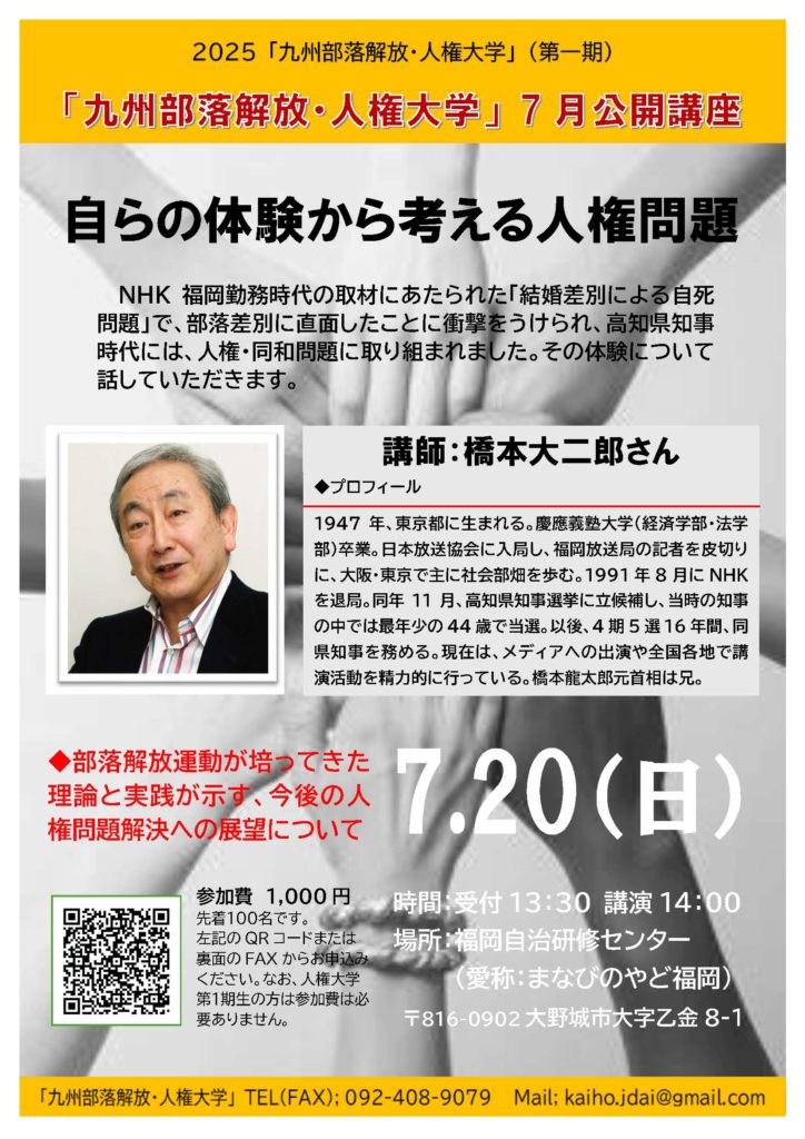 7月公開講座募集ページ 未分類 2025.07.152025.07.22 「九州部落解放・人権大学」では、7月20日(日)「九州部落解放・人権大学」7月公開講座を開催致します。詳しくは、チラシをご覧ください。 申し込みはこちら