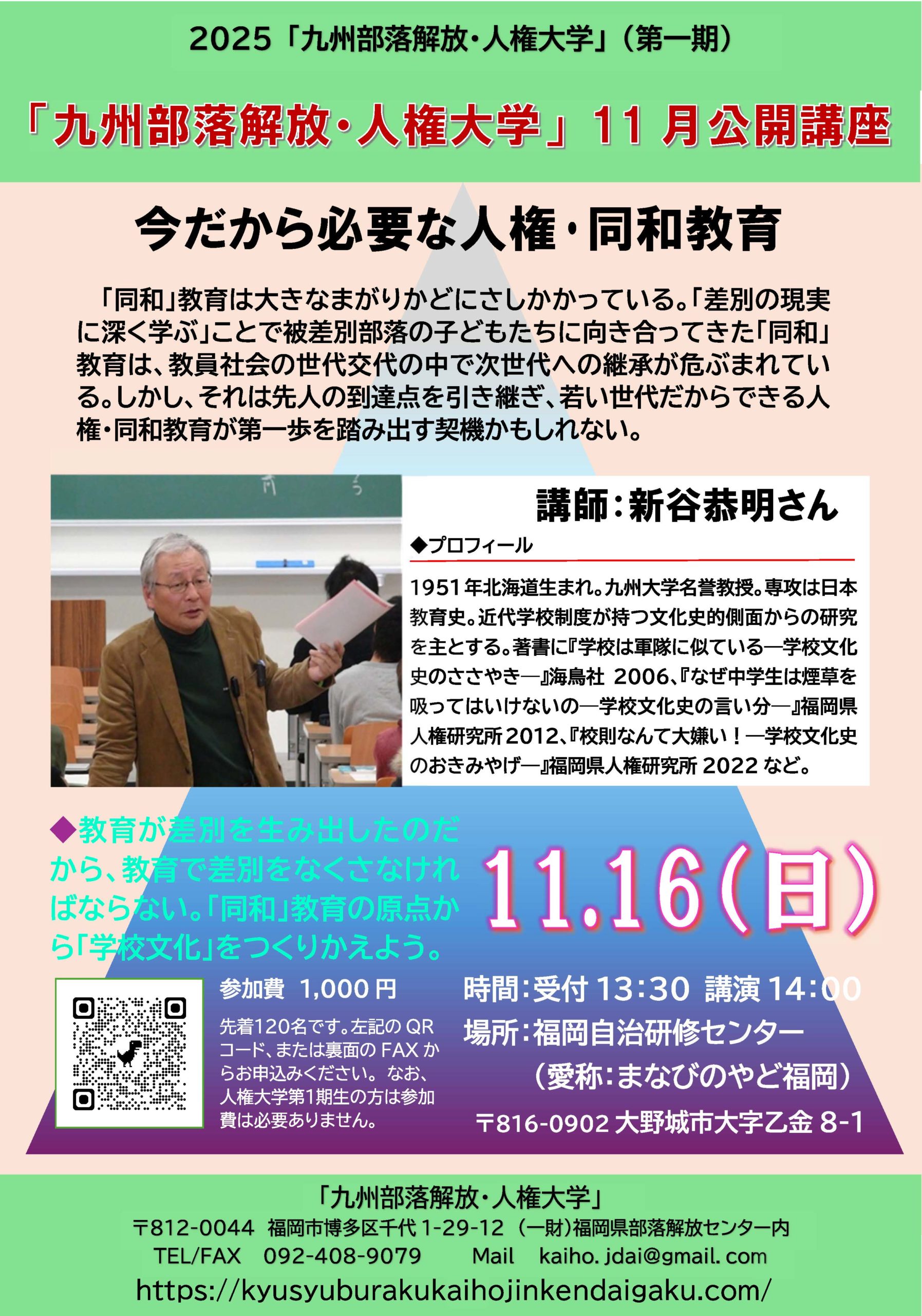 11月公開講座受講生募集 未分類 2025.09.222025.09.24 「九州部落解放・人権大学」では、11月16日(日)に公開講座を開催いたします。 今回のテーマは「今だから必要な人権・同和教育」講師:新谷恭明さんです。詳しくは、チラシをご覧ください。 申し込みはこちらから